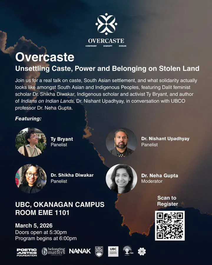 In the panel, Overcaste: Unsettling Caste, Power and Belonging on Stolen Land we have a real talk on caste, South Asian settlement in Canada, and what solidarity actually looks like amongst South Asian and Indigenous Peoples. The panel features Dalit feminist scholar Dr Shikha Diwakar, Indigenous scholar and activist Ty Bryant, and author of Indians on Indian Lands, Dr Nishant Upadhyay, in conversation with UBCO professor Dr Neha Gupta. Join us for this important conversation on March 5th at UBC Okanagan. Use the QRCode in the poster.